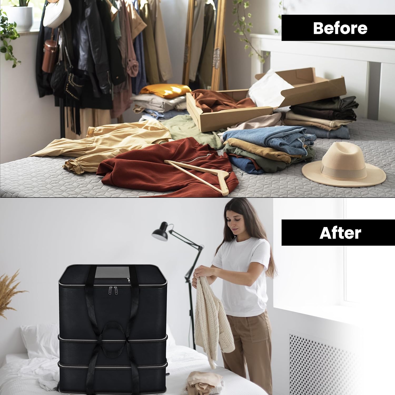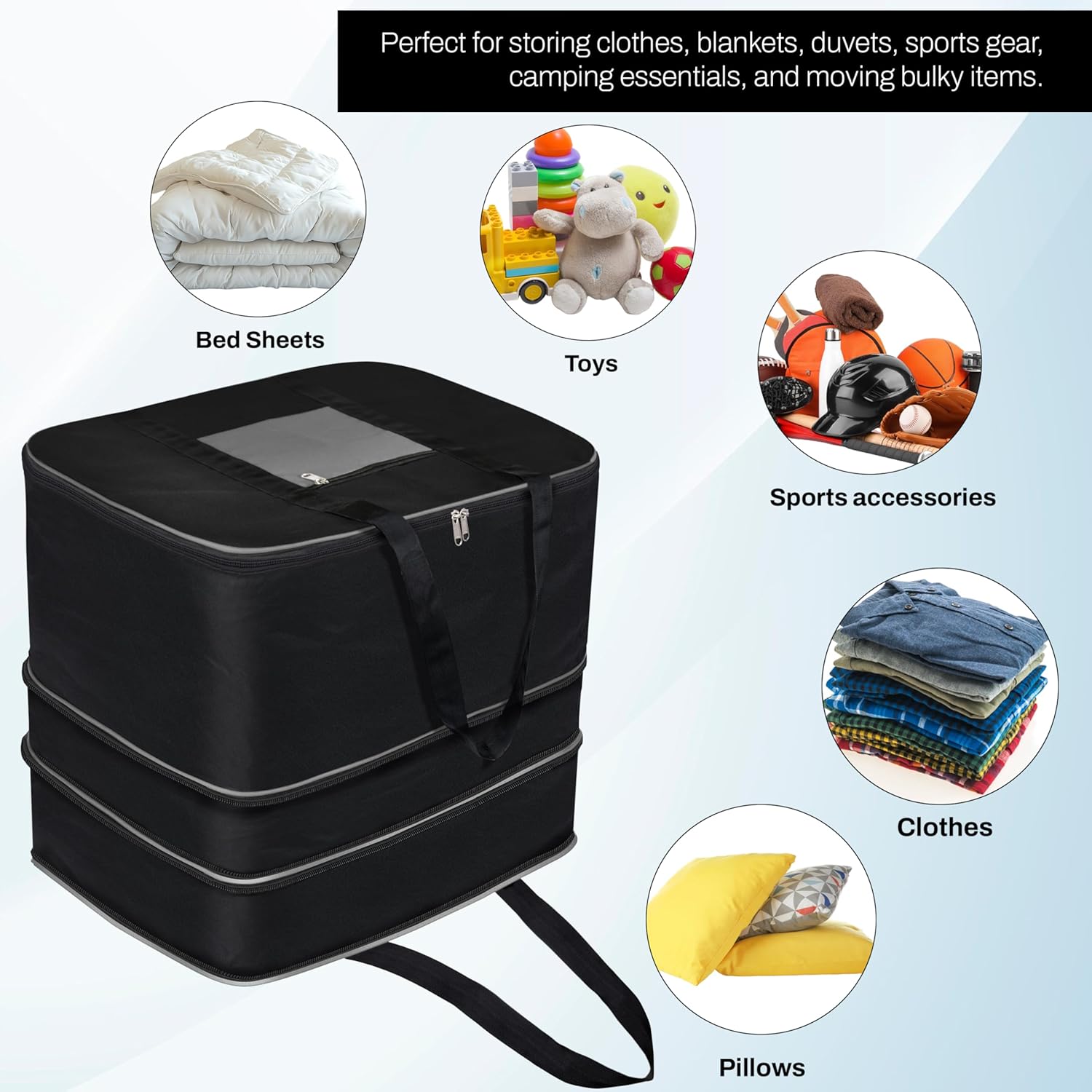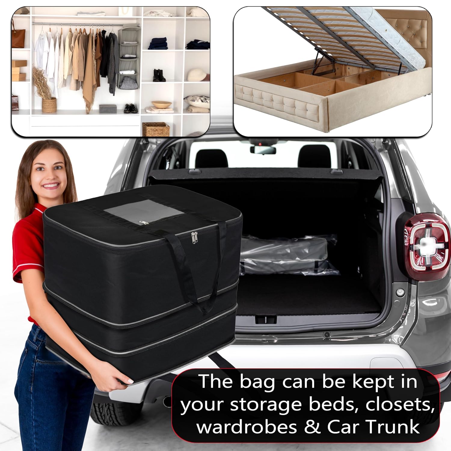 The spacious 173 L storage bag is designed to efficiently organize and store your clothes, bedding, and other household items. Measuring 57 x 49 x 62 cm This adjustable organizer will adjust to suit your momentary needs. Easily expandable to fit multiple bulky items such as blankets, pillows, winter coats, or boots. When there are less bulky items to store, the organizer collapses, so it appears neat and full.