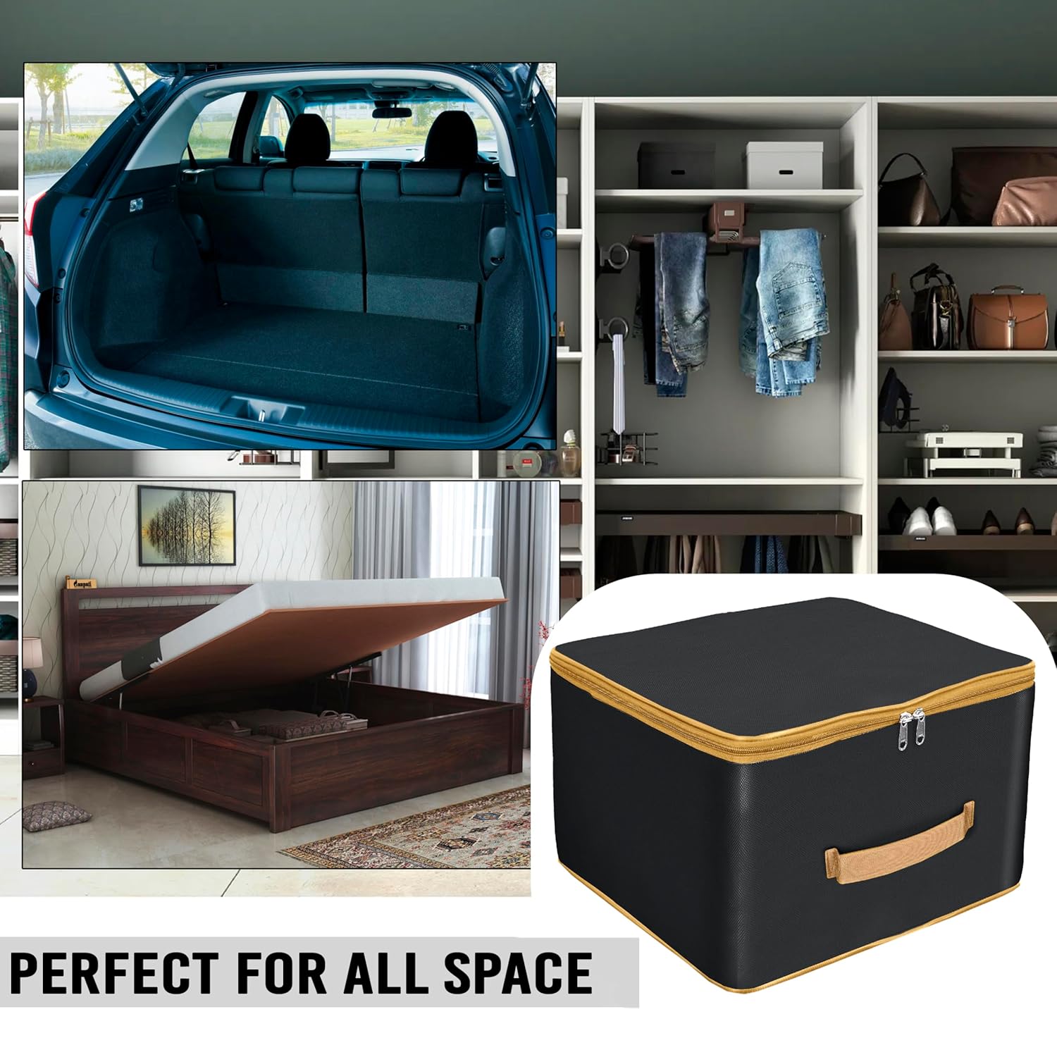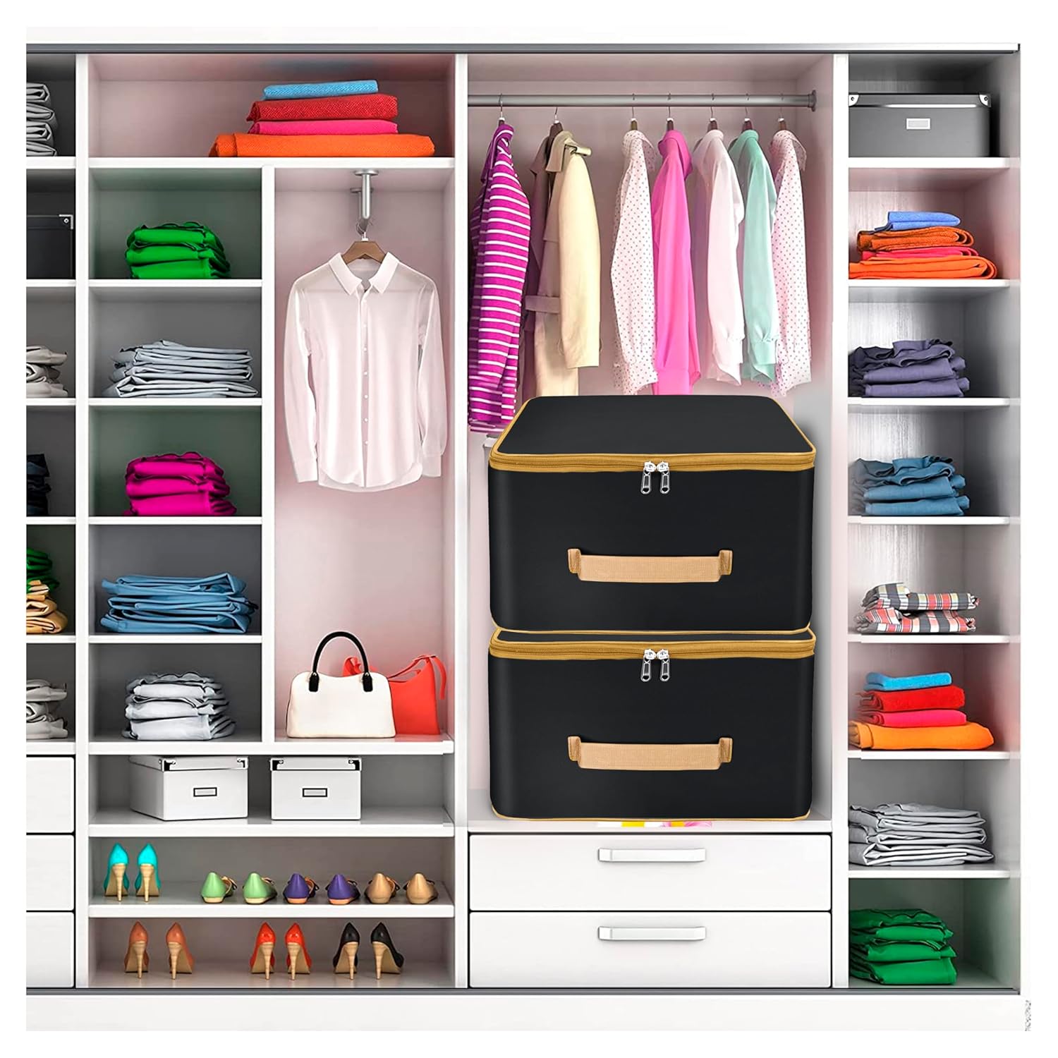 Storite Pack of 2 Nylon Wardrobe Bag Underbed Moisture Proof Cloth Storage Organizer, Storage box for Clothes Saree Bags with Zippered Closure & Handle Square(Black wih Gold Handle, 38x35.5x25 cm)