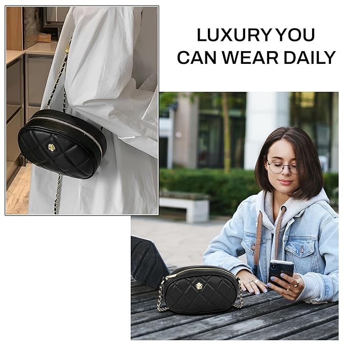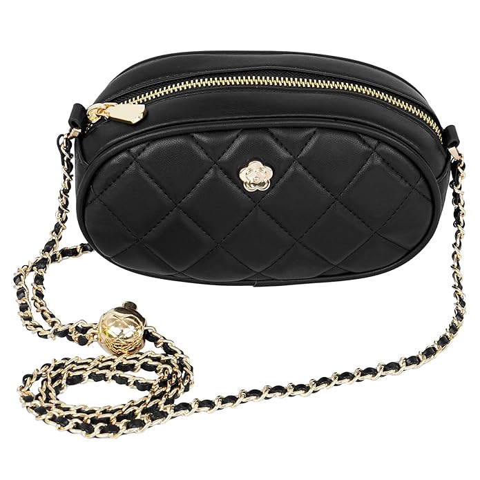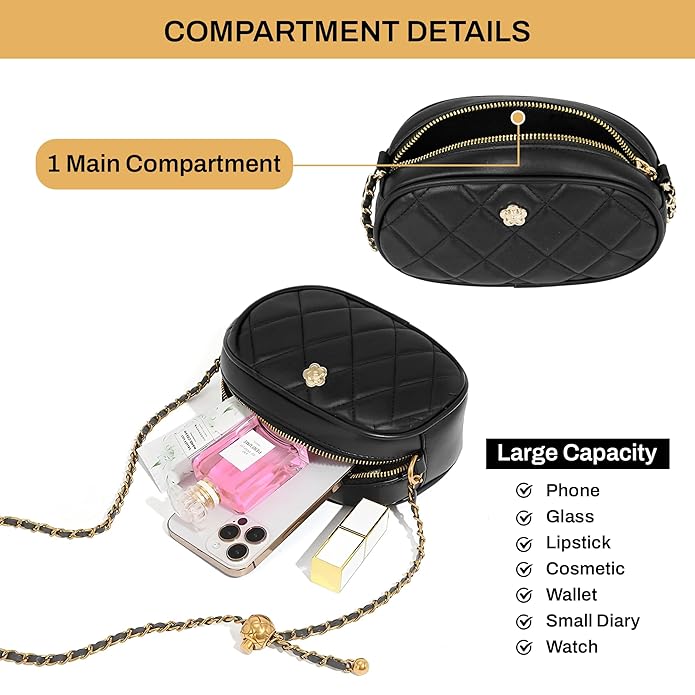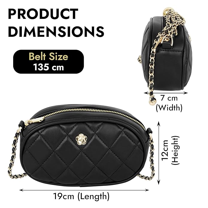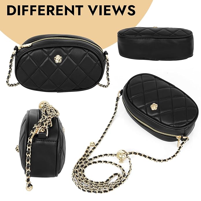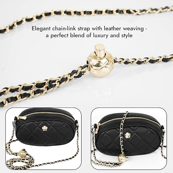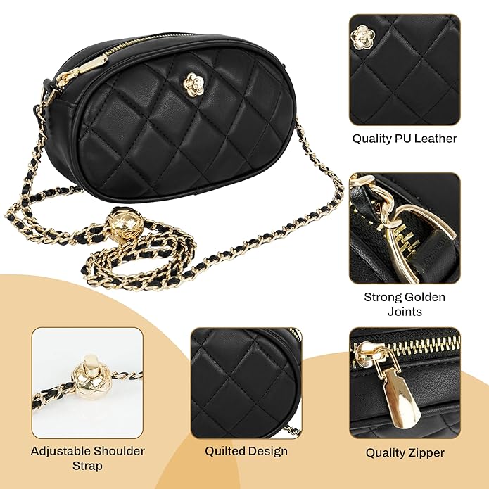 Storite PU Leather Quilted Sling Bag with Detachable Chain Strap, Crossbody Bag with Multi-Compartment for Women and Girls - Black