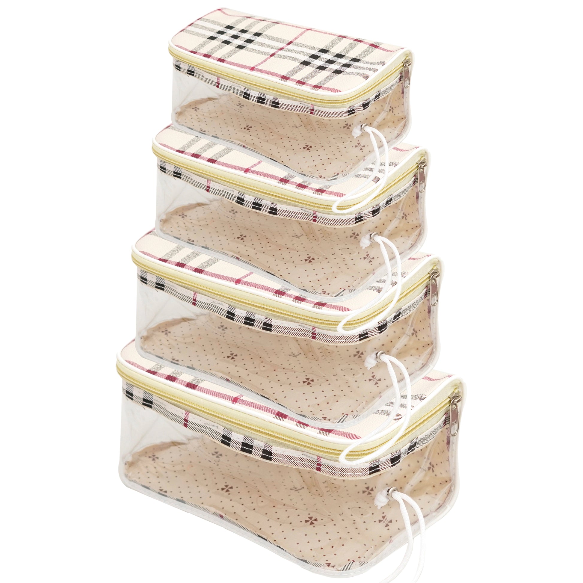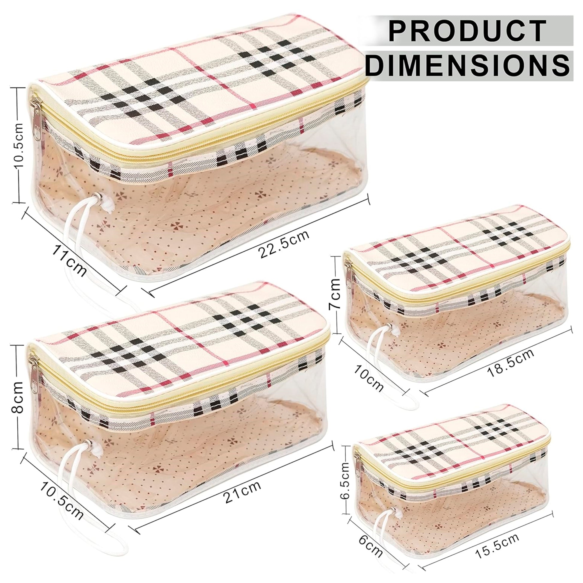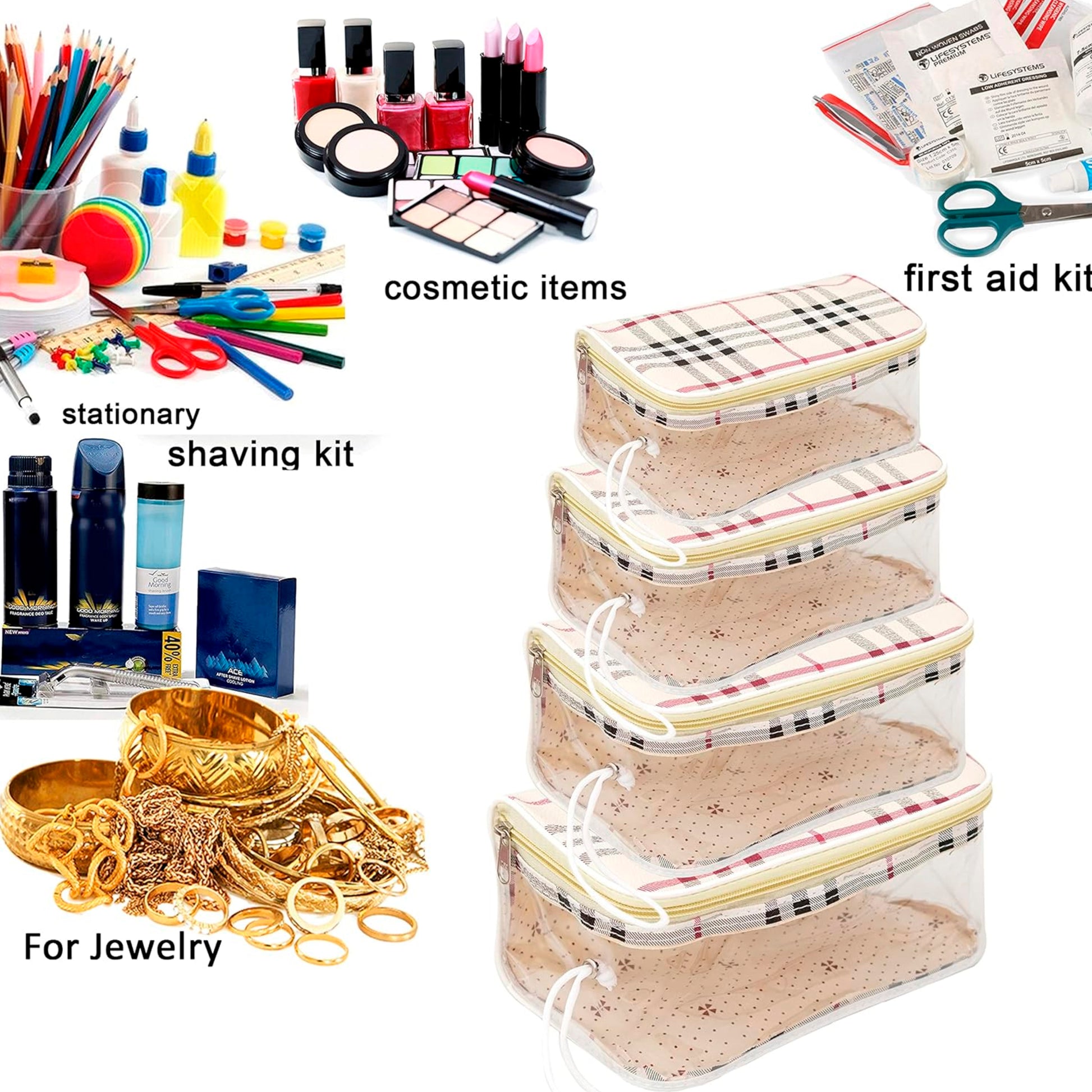 This versatile set of 4 multi-utility pouches combines style and practicality. Compact and lightweight, these pouches are perfect for travel or daily use. Made with a transparent design, they ensure quick access to your essentials while keeping them secure with a zip closure. Ideal for organizing cosmetics, toiletries, medicine, jewelry, stationery, or even diapers, these pouches are easy to clean and maintain, offering convenience for any purpose.