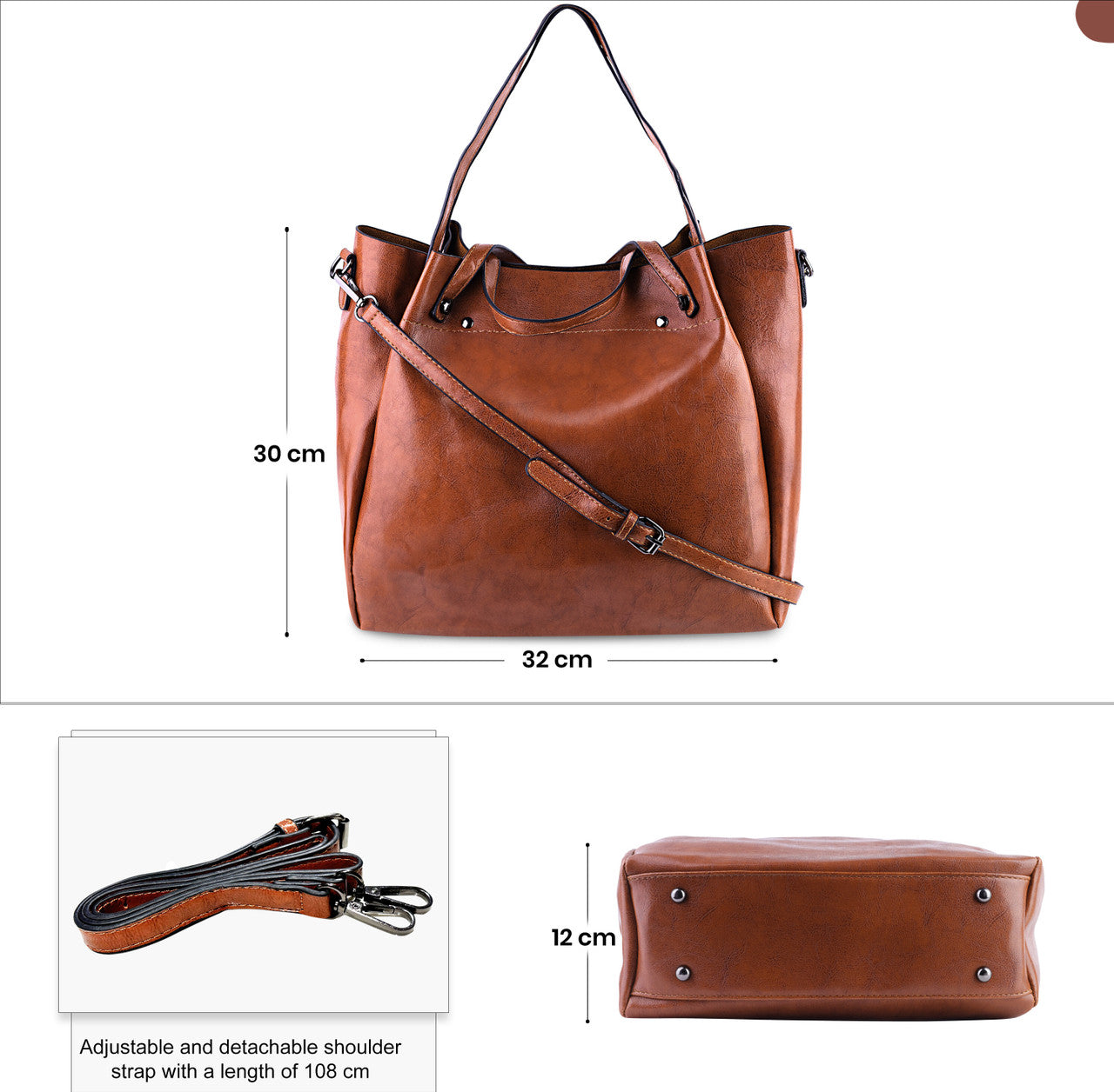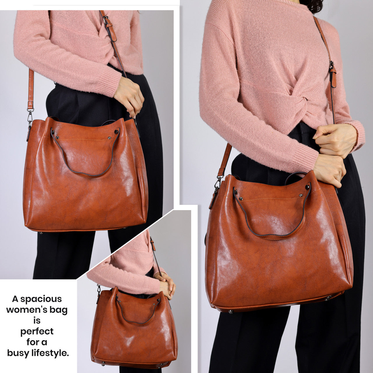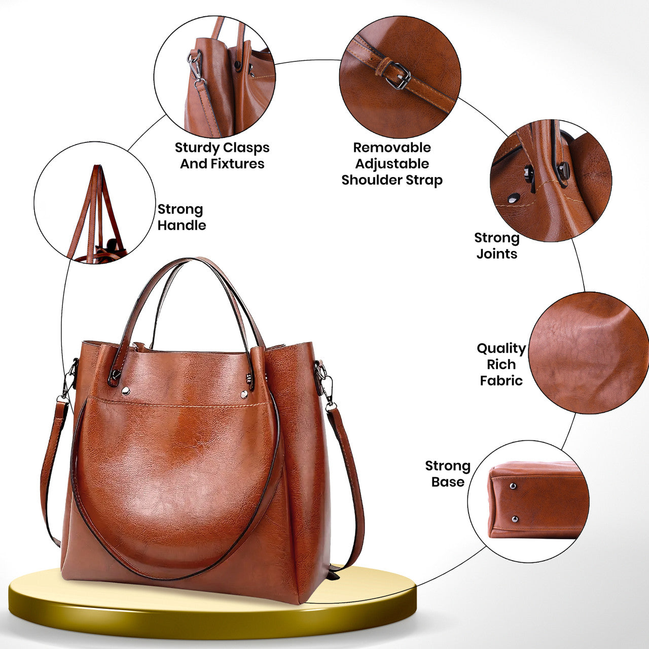 Crafted from quality-rich PU leather, this handbag can offer both durability and fashion. Its strong and reliable top handles can facilitate a secure and comfortable grip, while the sturdy clasps and fixtures ensure this bag's longevity. Moreover, its detachable and adjustable shoulder strap can add to its practicality and comfort. Furthermore, its strong joints and reinforced base can enhance its structural integrity. Lastly, its high-quality zipper closures can enhance security, keeping your items safe and within reach.